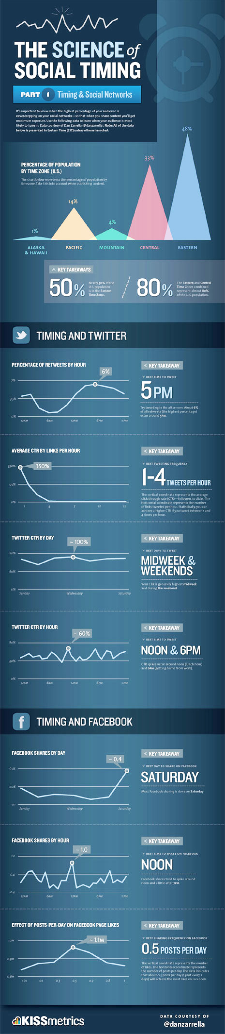 Para sacar el máximo provecho de los medios sociales como Facebook y Twitter, es importante conocer el momento o los momentos del día en que los usuarios están dispuestos a conectarse a tales redes sociales. De esta forma, los diferentes contenidos publicados en Facebook y Twitter lograrán la máxima atención posible por parte de los usuarios. Dan Zarrella y Kissmetrics han preparado una infográfica que subraya la importancia del timing en ambas redes sociales.